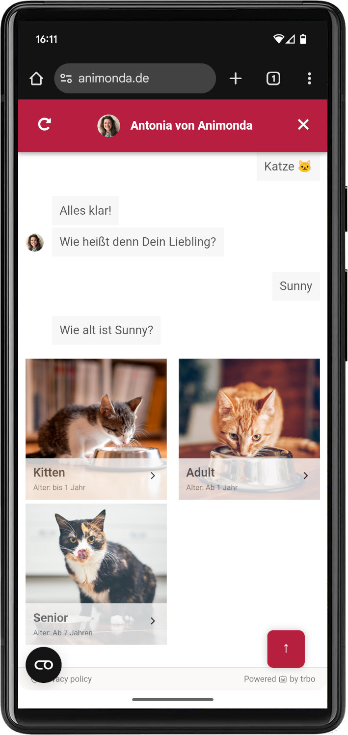 Mit nur wenigen Klicks erhältst du individuelle Futtervorschläge, die perfekt auf das Alter und die Bedürfnisse deiner Katze abgestimmt sind. Egal ob Kitten, Adult oder Senior, wir haben das richtige Futter für jede Lebensphase. Wenn deine Katze spezielle Ernährungsbedürfnisse hat, wie z. B. Krankheiten oder Allergien, findest du bei uns auch entsprechende Spezialnahrungen. Der Animonda Futterberater berücksichtigt dies, damit deine Katze die bestmögliche Unterstützung erhält.