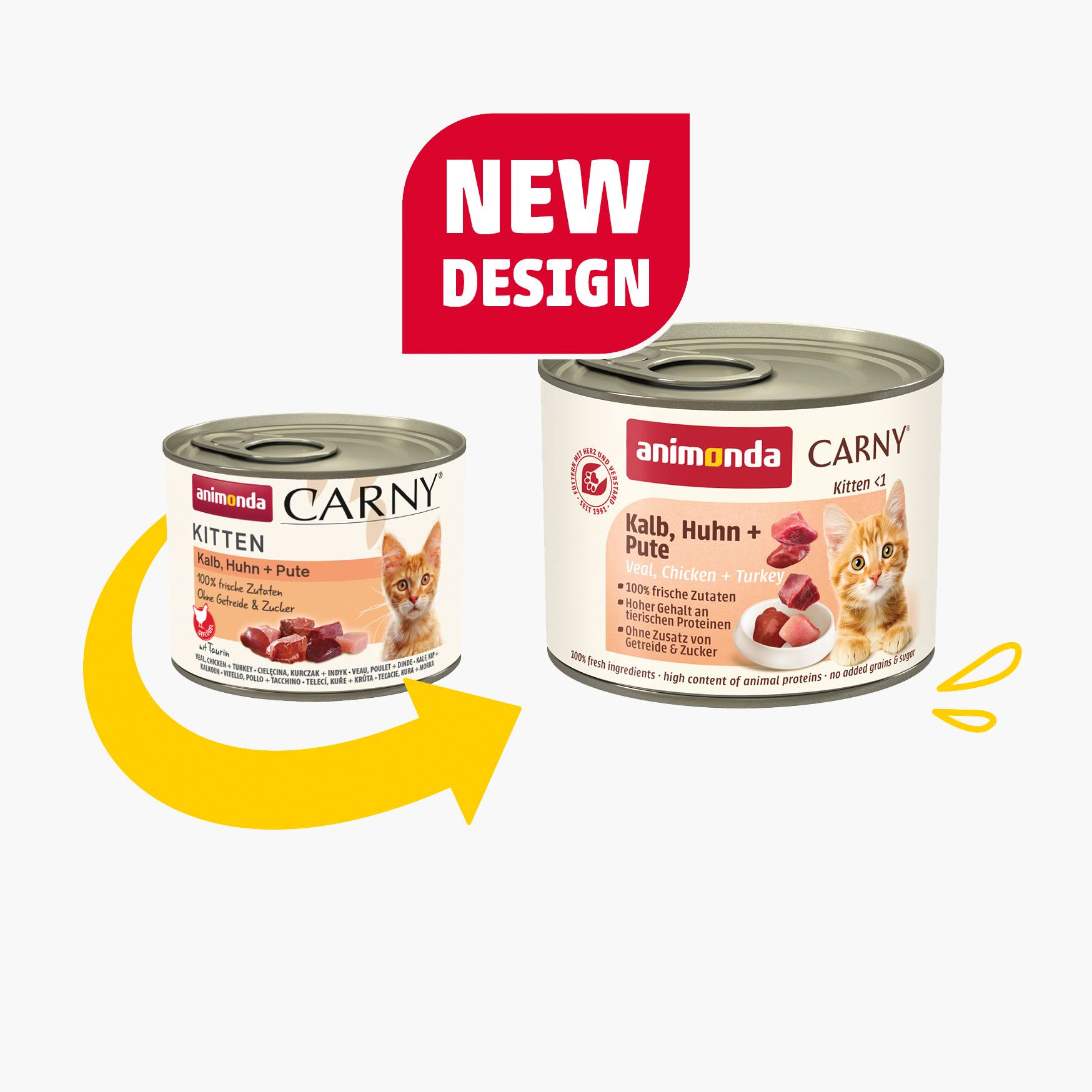 Zartes Kalb, bekömmliches Huhn und leckere Pute - Carny Kitten Kalb, Huhn + Pute vereint alle fleischlichen Zutaten zu einem geschmacklichen Genuss für Kätzchen! Die 100 % frischen, fleischlichen Zutaten sind kätzchengerecht zerkleinert, sodass Kitten es leicht aufnehmen können.